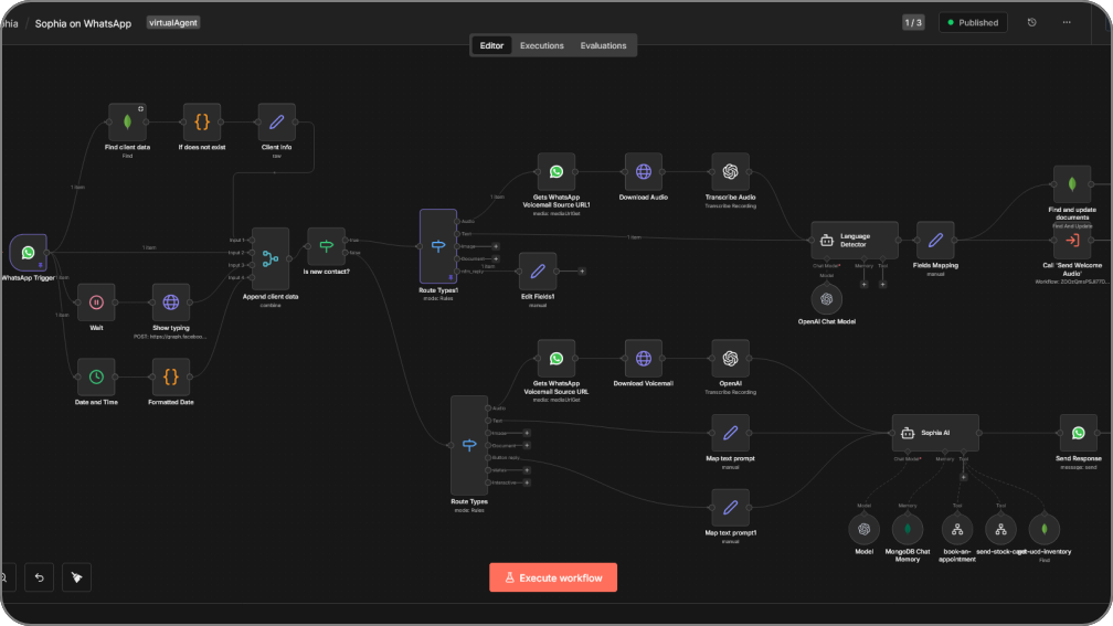 Sophia is a production AI conversational agent operating over WhatsApp Business to automate the automotive sales process from initial lead capture through appointment scheduling. She manages multilingual conversations, qualifies leads, queries live inventory, and books appointments — without human intervention for routine interactions.